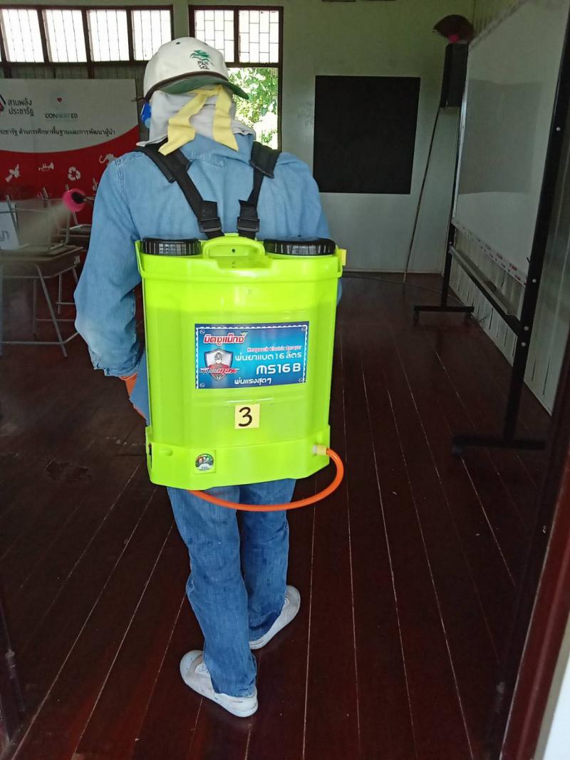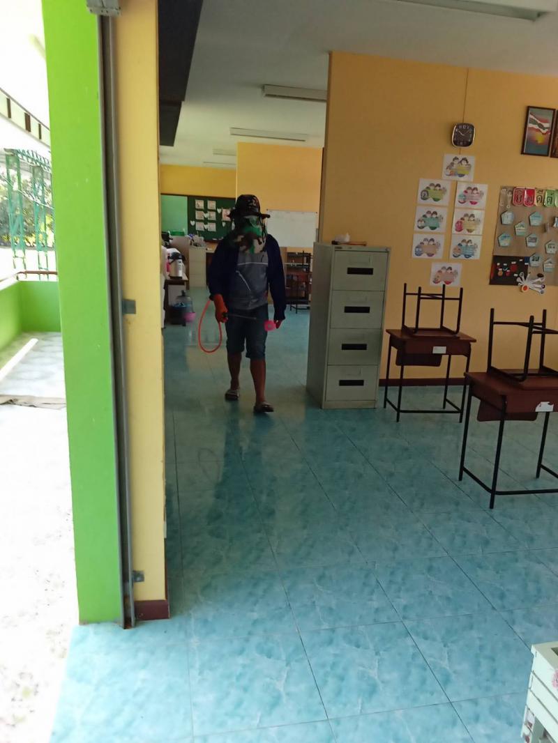 ภาพกิจกรรมการฉีดพ่นน้ำยาฆ่าเชื้อเพื่อเตรียมความพร้อมตามมาตรการป้องกัน COVID 19 ก่อนเปิดเทอม