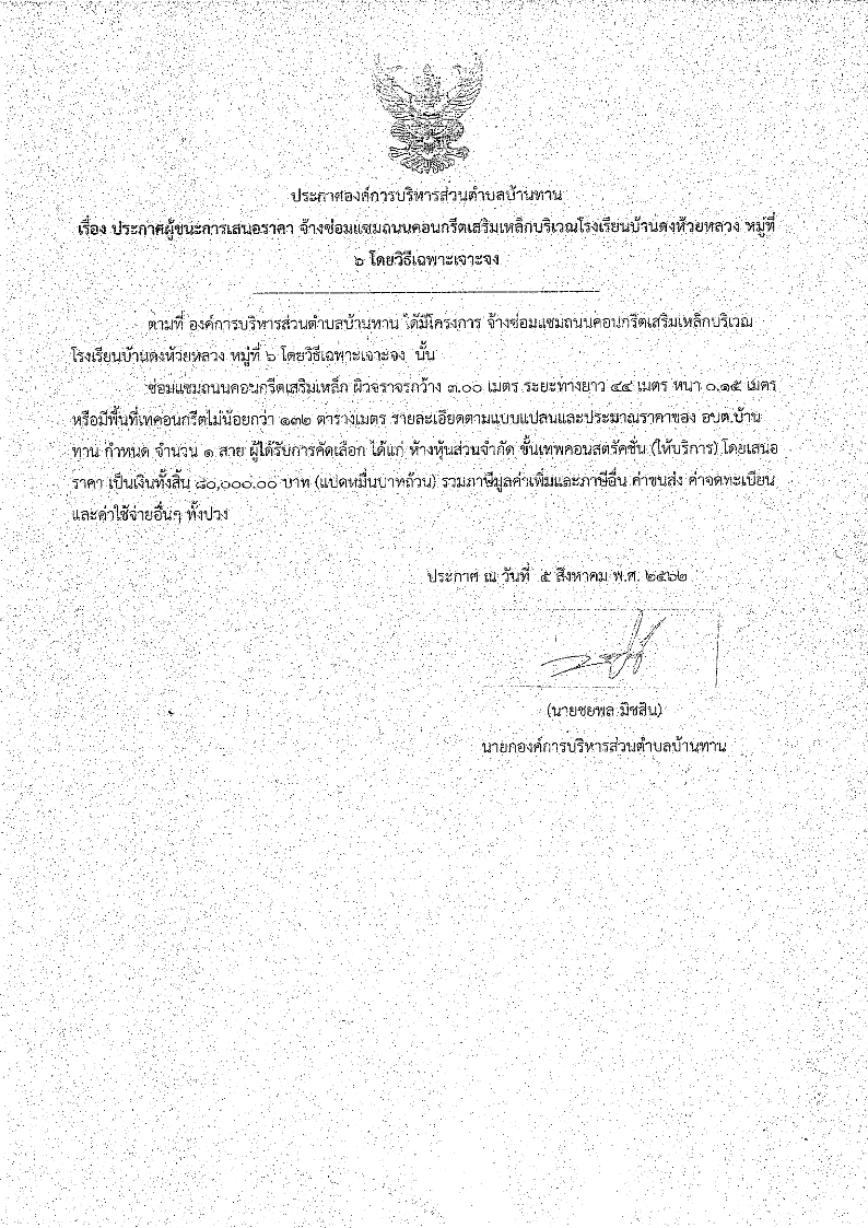 ประกาศผู้ชนะการเสนอราคา จ้างซ่อมแซมถนนคอนกรีตเสริมเหล็กบริเวณโรงเรียนบ้านดงห้วยหลวง หมู่ ๖