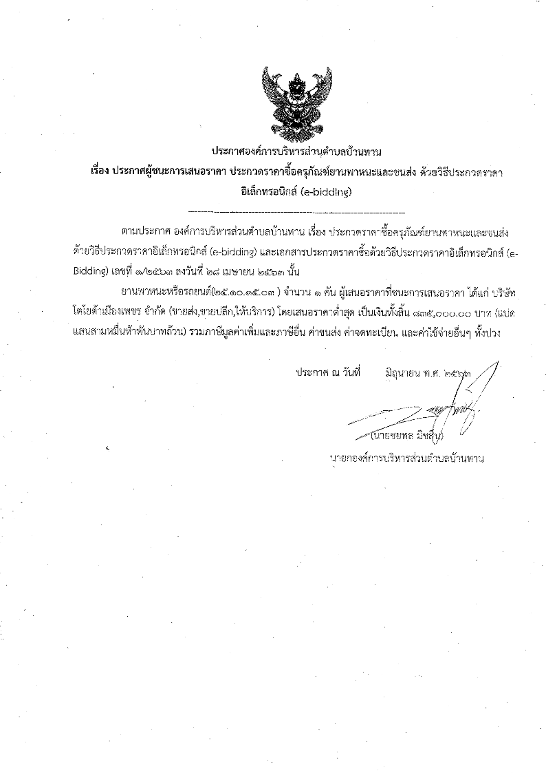 ประกาศผู้ชนะการเสนอราคา ประกวดราคาจัดซื้อครุภัณฑ์ยานพาหนะและขนส่ง (๒)