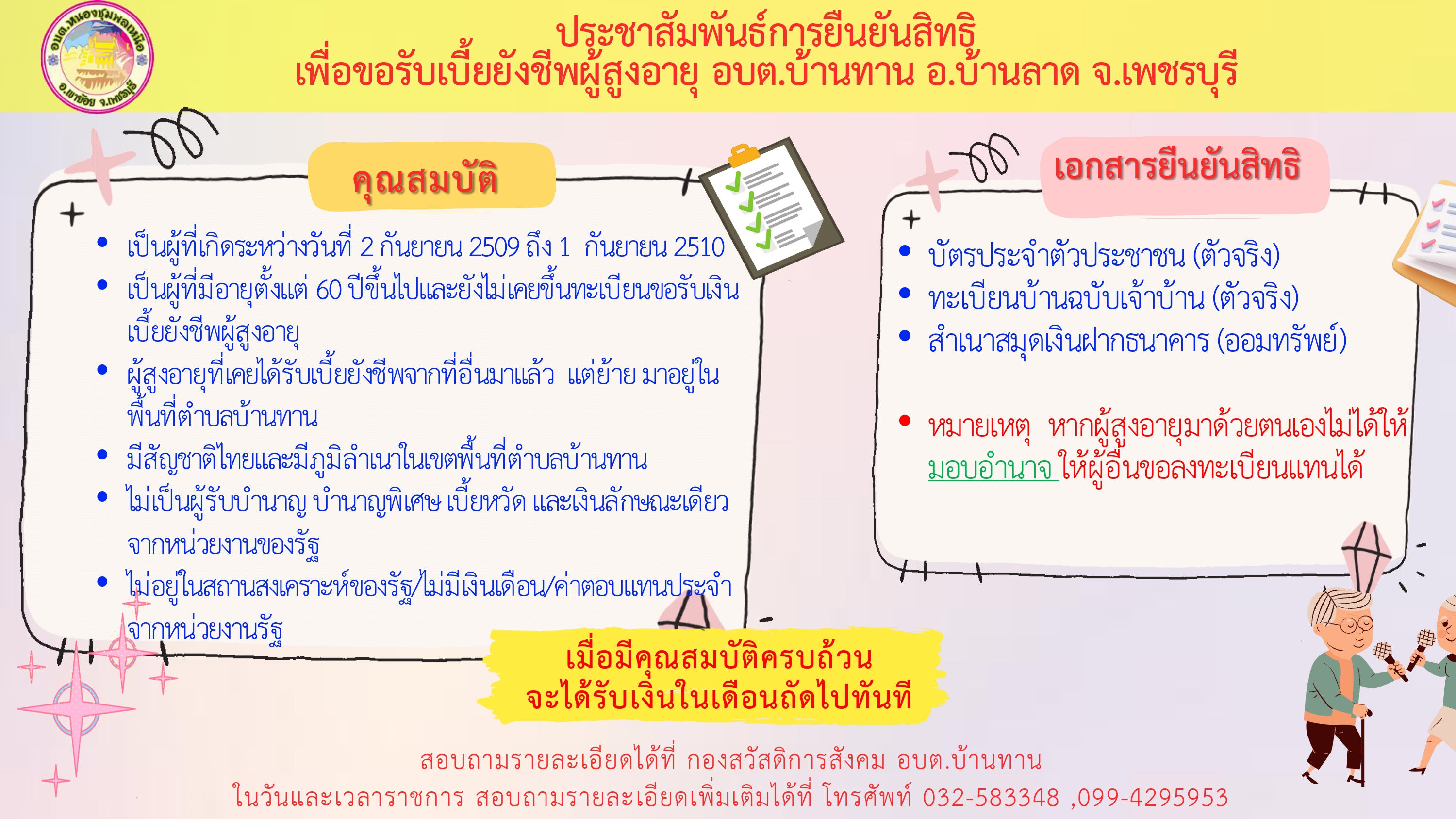 ประชาสัมพันธ์การยืนยันสิทธิ เพื่อขอรับเบี้ยยังชีพผู้สูงอายุ อบต.บ้านทาน อ.บ้านลาด จ.เพชรบุรี